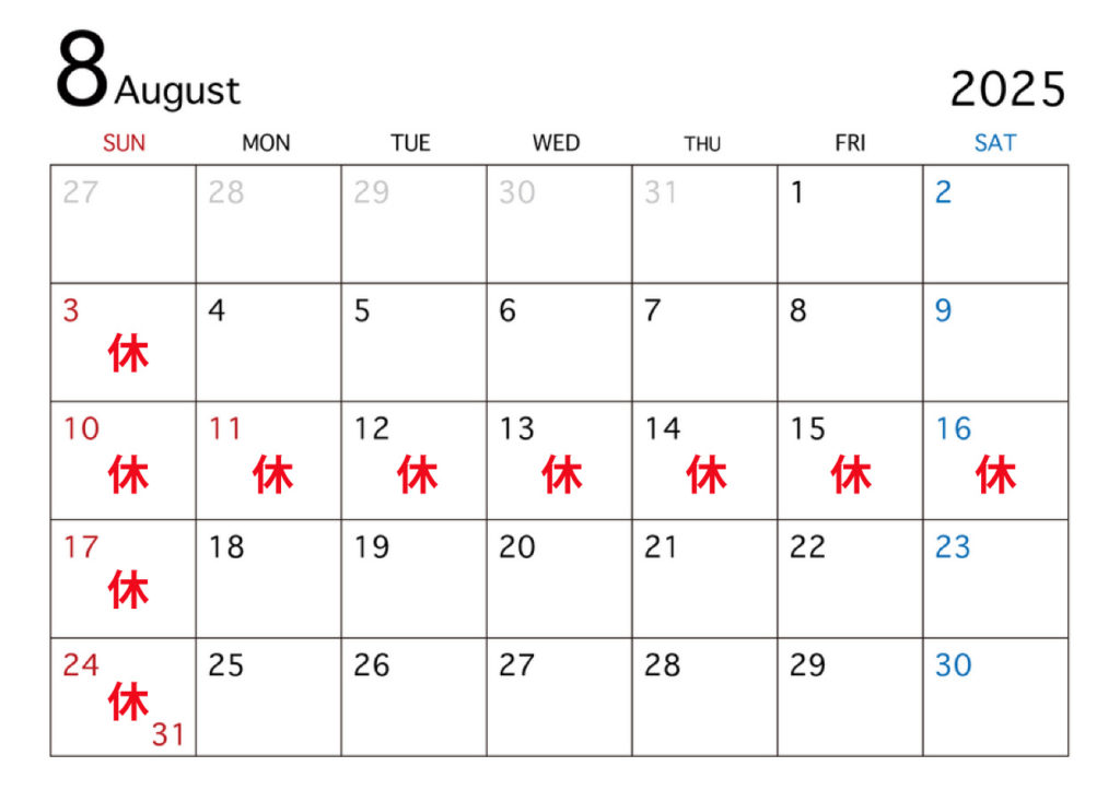 8月の営業日2025.07.23 Share この記事のタイトルとURLをコピーする共有: Facebook で共有するにはクリックしてください (新しいウィンドウで開きます) Facebook クリックして X で共有 (新しいウィンドウで開きます) X Post Share この記事のタイトルとURLをコピーする 7月の営業日前の記事 臨時休業のお知らせ次の記事